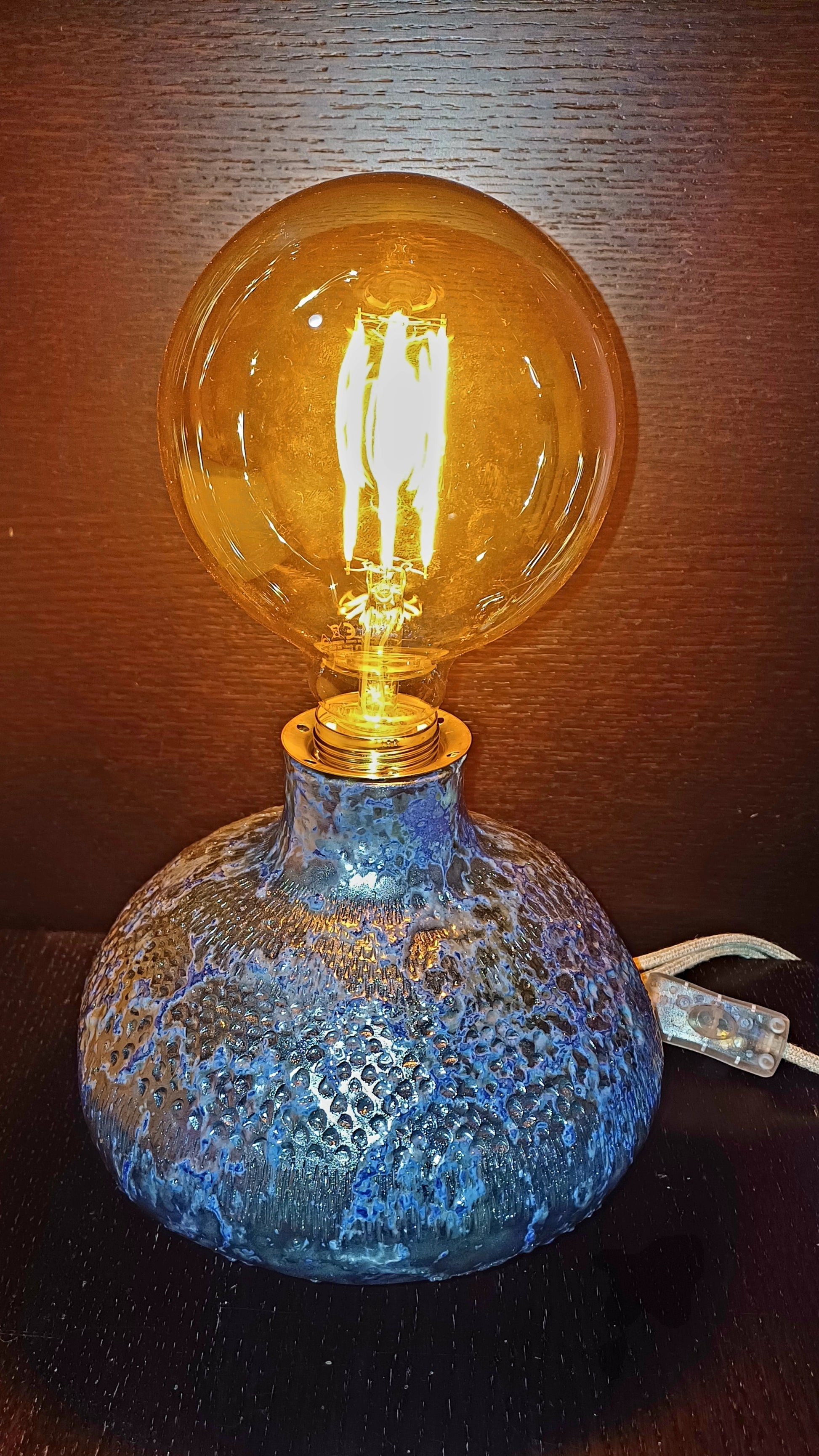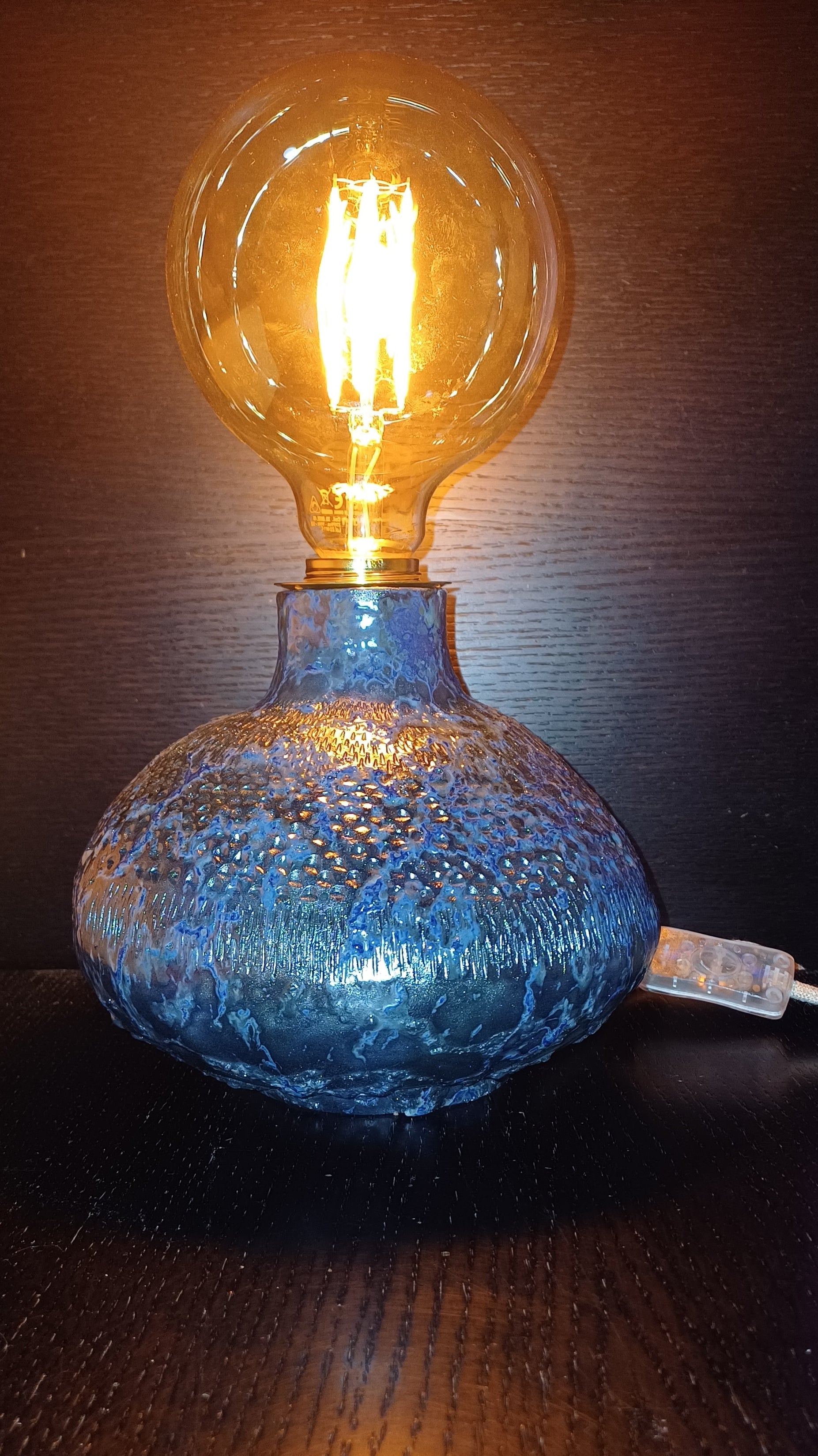 Vaso portalampada in ceramica bianca realizzato interamente a mano, pezzo unico d'arte materica. La struttura è caratterizzata da una superficie organica e irregolare, impreziosita da una smaltatura artistica a smalti speciali che creano un gioco cromatico vibrante sui toni del blu cobalto, argento e viola.
