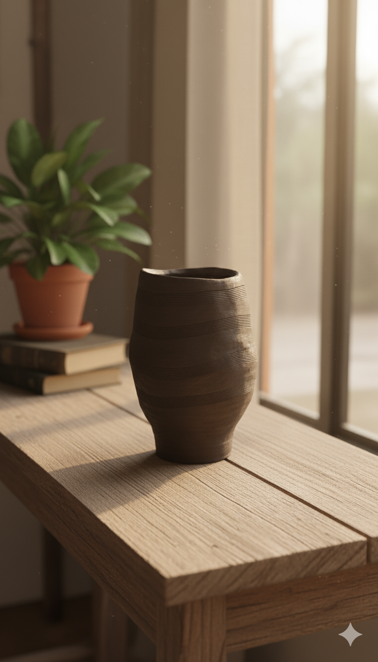Il vaso ha un'estetica rustica e minimalista, che celebra l'imperfezione e l'unicità del fatto a mano. Potrebbe essere utilizzato per contenere fiori o semplicemente come oggetto d'arte.