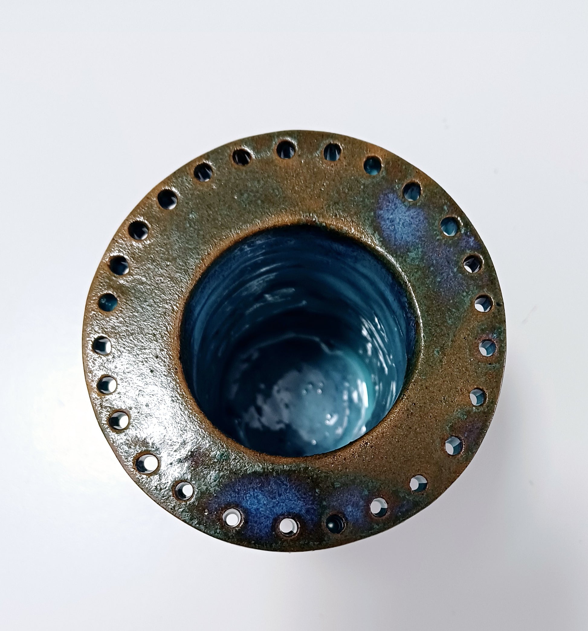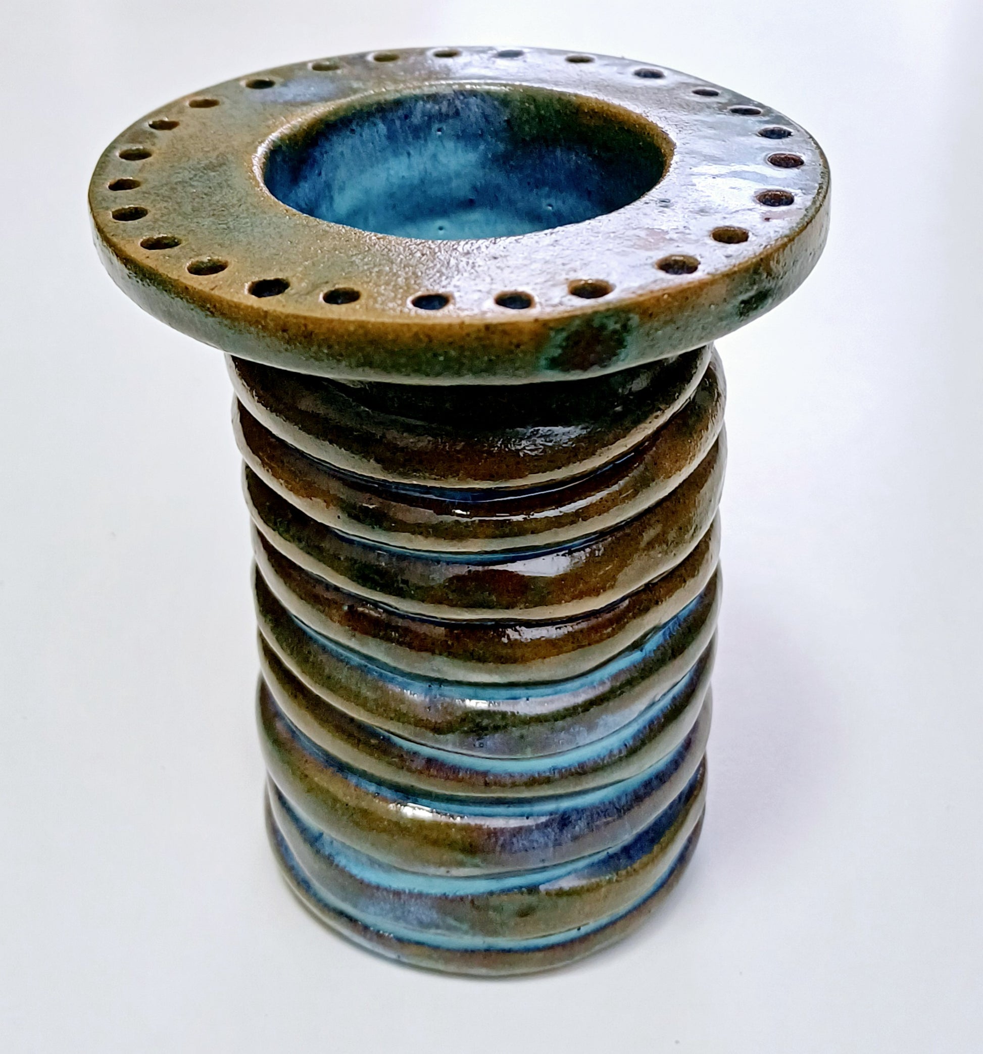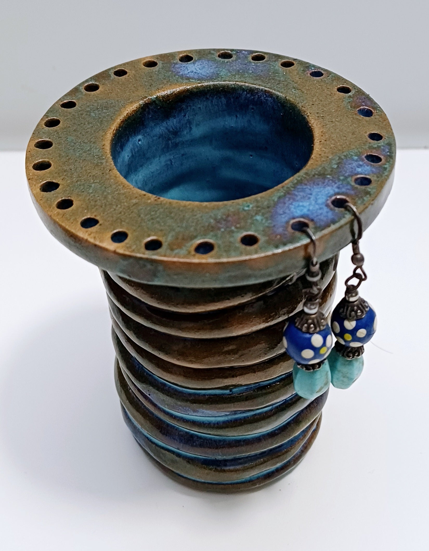Portagioie e organizer multifunzione in ceramica rossa realizzato a mano, caratterizzato da un corpo a spirale che richiama la filettatura di una vite. La smaltatura con smalti speciali crea un sofisticato contrasto tra le tonalità brune della terra e i riflessi azzurrati che emergono nelle profondità della trama materica.
